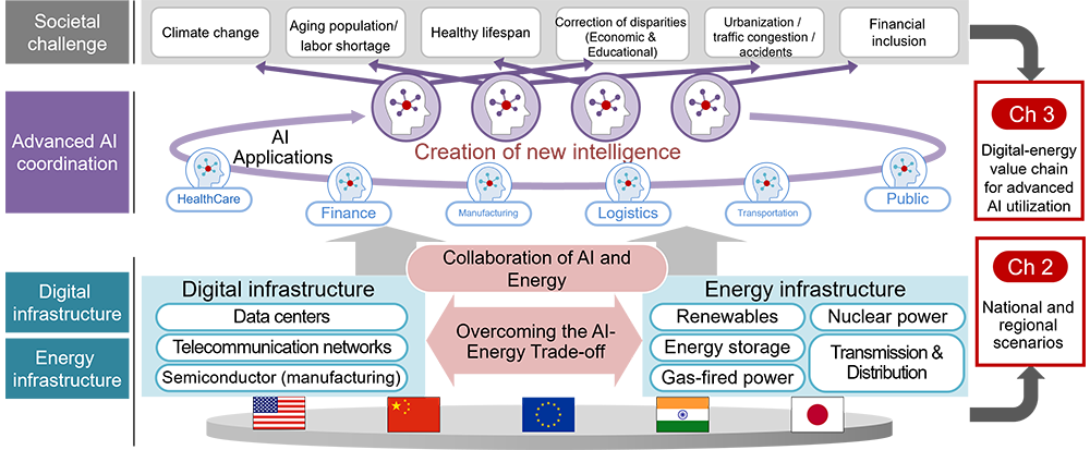 Figure 2 illustrates a vision for 2035 where AI and energy work together to realize a sustainable society, overcoming the trade-offs between digital and energy infrastructure by fully leveraging technology. The specific shape of this future vision will differ based on the unique energy infrastructure circumstances of each country and region. Therefore, Chapter 2 will provide an overview of global and key regional energy infrastructure scenarios for 2035. Meanwhile, the characteristics of AI model training and inference vary depending on the specific application within an industry, such as R&D in pharmaceuticals or operations and maintenance in manufacturing. Consequently, the digital and energy infrastructure needs of these industries also differ. Chapter 3 will therefore explore the future symbiotic value creation system (referred to as a "value chain" in this report) of digital and energy infrastructure that will support advanced AI applications in 2035. Finally, Chapter 4 will outline the challenges ahead in forming a new ecosystem where digital and energy infrastructures achieve true collaboration.