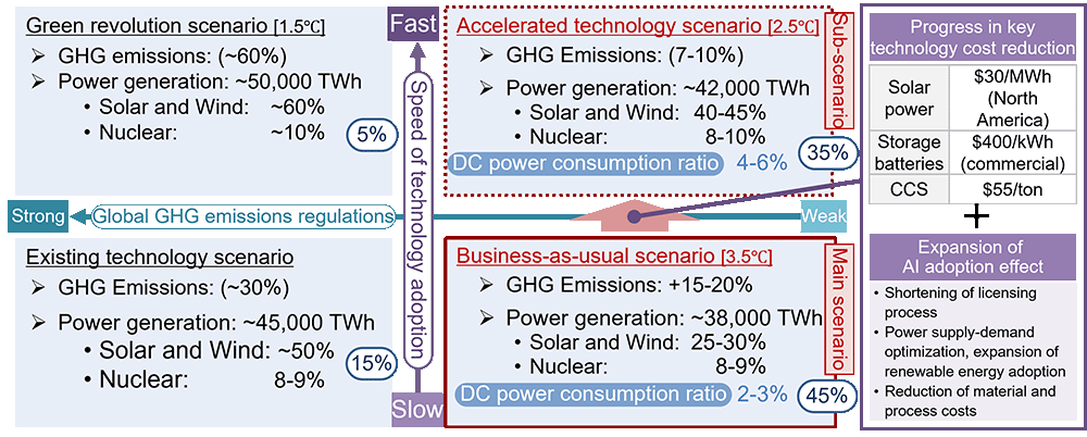 The vision outlined in Section 1.2—one characterized by advanced AI utilization supported by a strengthened energy supply for digital infrastructure—could align with the Accelerated Technology Scenario. However, as will be discussed later, apart from trends in global GHG regulations and the speed of spreading a wide range of technologies, it is also necessary to consider the possibility of independent progress in the adoption of AI-related energy technologies due to national and regional industrial policies and private investment.