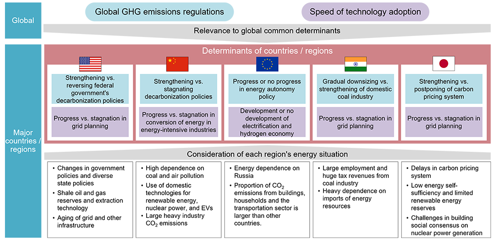 Country- and region-specific scenarios must reference the two global determinants while incorporating unique local energy determinants (Figure 4). Using the same methodology as the global analysis, two key determinants were selected for each region. For the U.S., they are the intensification or reversal of federal decarbonization policies, and the progress or stagnation of plans to expand and upgrade the T&D grid. For Europe, they are progress in the energy autonomy policy and development of electrification and a hydrogen economy. For Japan, the drivers are progress in strengthening the carbon pricing system and, similar to the U.S., the progress of its T&D grid expansion plan.