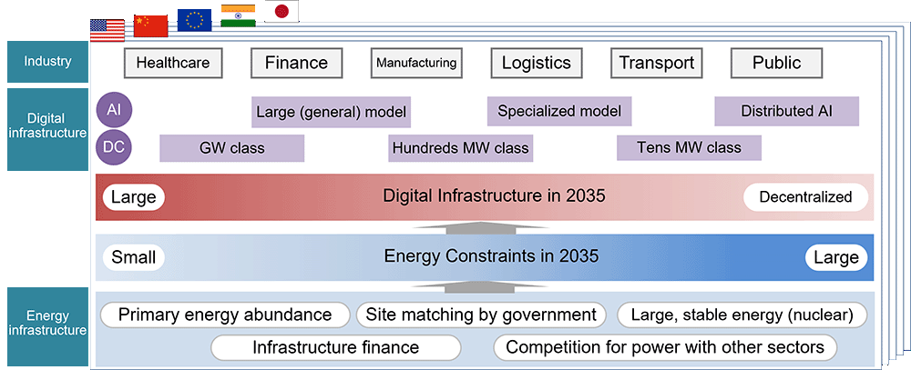 Japan, on the other hand, has scarce domestic energy resources, and building new nuclear power plants remains difficult under current conditions, resulting in significant energy constraints. Therefore, under any scenario, the hurdle for constructing GW-scale DCs is high. For Japan, developing and utilizing specialized models and distributed AI via small- and medium-sized DCs emerges as the more pragmatic path.