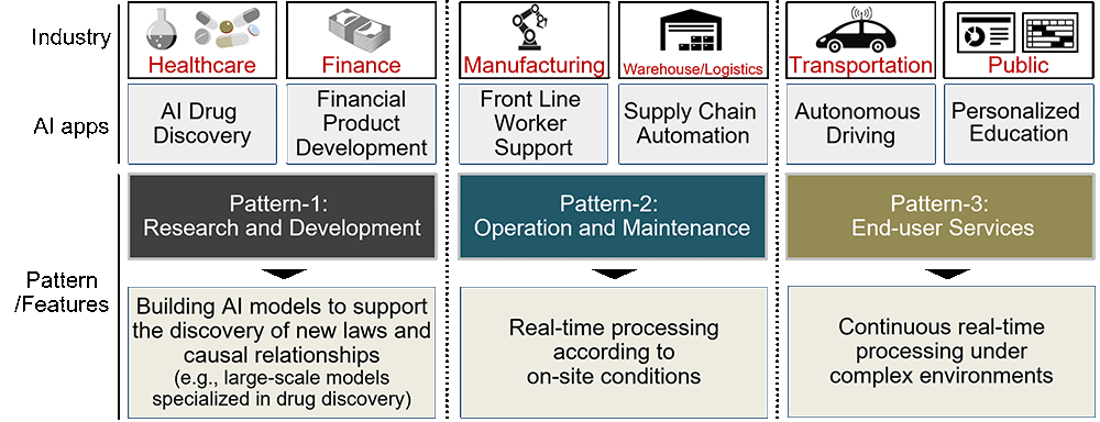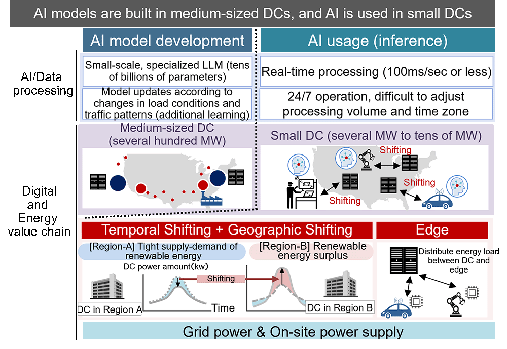 In the end-user services, applications must respond instantly to real-world environment changes. This requires constant real-time processing under complex conditions, in addition to the use of specialized AI models. For example, autonomous vehicles must continuously make judgments and control actions by instantly processing a multitude of variables—pedestrians, signals, other vehicles, weather, and road conditions. Training advanced AI models (tens of billions of parameters) that enable this level of judgment is expected to require mid-sized DCs (hundreds of MW). During the AI utilization phase, low-latency and efficient inference can be achieved by deploying small, distributed DCs in urban areas where many users access the service simultaneously. In scenarios where devices like autonomous vehicles are constantly generating and processing data, requiring continuous AI inference, the load on specific DCs can become immense. Therefore, in addition to temporal load shifting, a combination of geographic load balancing across multiple DCs and load distribution between DCs and the edge (devices) is employed. This enables end-users and service providers to have a seamless and safe experience, free from concerns about communication latency.