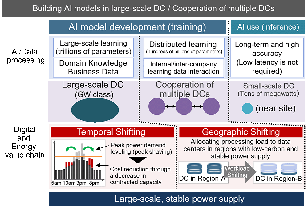 AI models for research and development are expected to be large-scale (hundreds of billions of parameters or more), with enormous computational requirements for training. This suggests that training will be processed centrally at large, GW-scale DCs. While this processing incurs massive power demand, the training itself does not require high-real-time performance. This allows for temporal load shifting—distributing the AI processing load by scheduling training tasks during off-peak hours, such as at night or when renewable energy supply is abundant. This practice enables the leveling of DC power demand and peak shaving. However, given power supply and other constraints, not all regions or companies can build models on large-scale DCs. An alternative approach is federated or distributed model training, where multiple DCs collaborate. In such cases, geographic load distribution among DCs in different locations makes it possible to maximize the use of regional energy resources, thereby enabling more sophisticated and efficient processes in fields like drug discovery and financial product development.