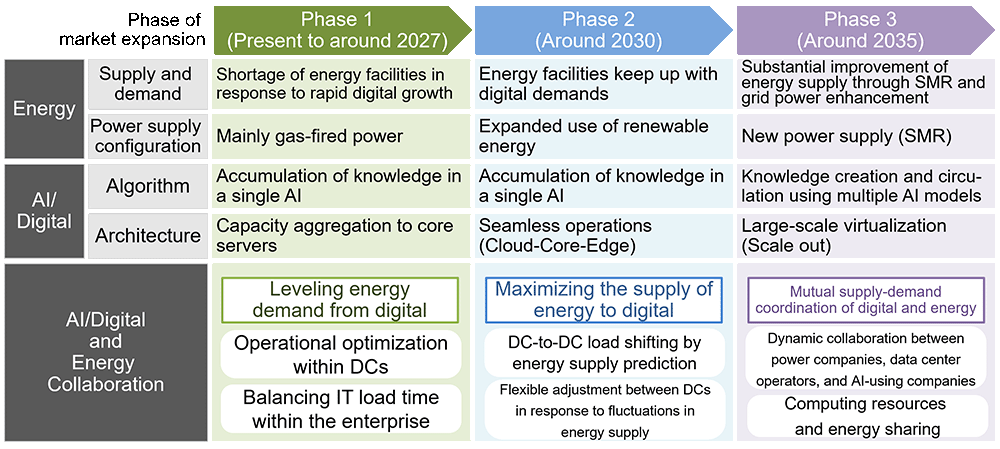 The challenges and solutions for realizing advanced AI will evolve in phases according to the supply-demand dynamics of energy for the AI/digital sectors. As shown in Figure 11, Phase 1 (Present to around 2027) is characterized by an energy supply deficit relative to the rapid growth in AI/digital demand. In this constrained environment, the primary challenge is to level energy demand from digital, as computational processes must operate within limited energy envelopes. This requires solutions like operational optimization within DCs and temporal shifting of IT workloads within the enterprise. In phase 2, energy supply capacity will begin to catch up with digital demand by the expansions of new renewable energy facilities and grid, though it cannot fully meet the demand. At this stage, maximizing energy delivery to the digital sector will be required through demands dynamic adjustments, such as flexible load shifting between DCs based on energy supply forecasts or moving workloads from DCs in energy-strained regions to those with a surplus. In Phase 3, significant energy supply enhancements from sources like SMRs and a reinforced grid will be sufficient to meet digital demand. Advances in AI technology and next-generation communication networks will enable mutual supply-demand orchestration between the digital and energy sectors. While dynamic coordination among power companies, DC operators, and AI users is expected, it also presents new challenges that massive datasets between AI models operating across different domains could cause intensive, short-duration computational loads on DCs. In such scenarios, the risks of sudden computational load spikes and communication latency become critical so flexible load management will be required through sharing computational resources among DC operators and AI users and implementing task prioritization. This allows for the dynamic adjustment of where and when high-intensity loads are processed. Ultimately, this advanced orchestration will enable specialized AI models from different industries and applications to collaborate in real-time, jointly tackling complex tasks and this is expected to make significant contributions to solving multifaceted societal challenges, including climate change and disaster response.