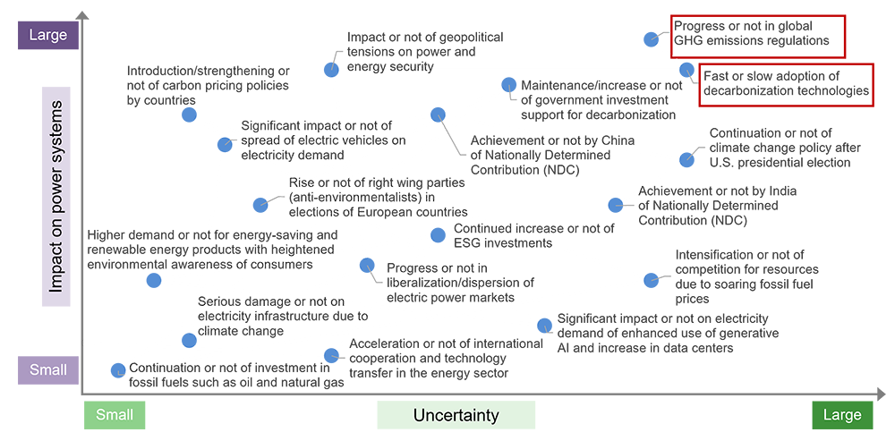 In the U.S., the second Trump administration, inaugurated in January 2025, issued an executive order to promote the use of oil, natural gas, and coal. The main scenario posits that federal decarbonization policy will remain stagnant long-term, but that T&D grid development, aimed at fostering industrial growth, will proceed regardless of the administration. Europe, after prioritizing environmental measures under its Green Deal policy since 2020, has recently shifted focus toward industrial competitiveness and innovation with its Clean Industrial Deal. However, high costs are forcing a review of hydrogen projects, raising concerns about achieving the 2030 targets for domestic hydrogen production and imports. The main scenario assumes that while energy autonomy policies will advance, the development of the broader electrification and hydrogen economy will be delayed. In Japan, the Seventh Strategic Energy Plan was approved by the Cabinet in February 2025, scheduling the introduction of a mandatory emissions trading system (GX-ETS) within the GX League framework. The main scenario assumes that the carbon pricing system will continue to be strengthened, but that the development of the T&D grid will be delayed.