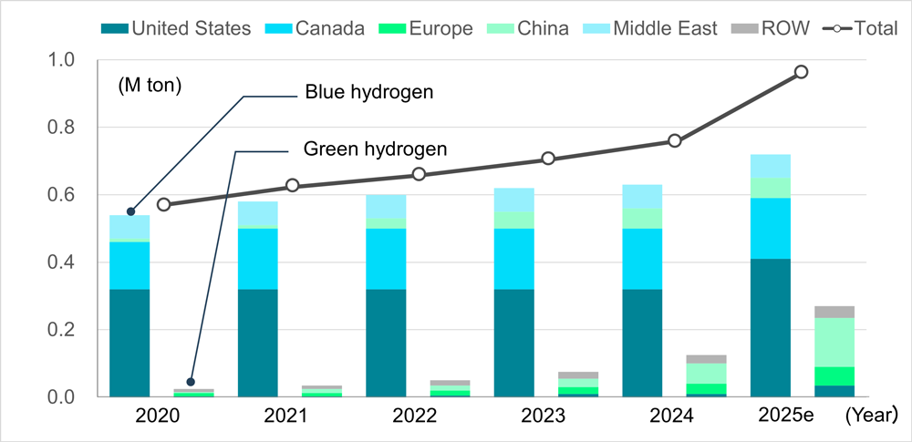 Green and blue hydrogen*1, regarded as key solutions for decarbonization and energy security, reached a combined global production volume of over 700,000 tons in 2024, marking a 10% increase from the previous year (Figure 1). However, this amount accounts for only about 1% of the total hydrogen currently produced, which is primarily used for industrial and oil refining purposes. Most of the hydrogen produced today is gray hydrogen derived from fossil fuels. Most blue hydrogen production takes place in the United States and Canada, while more than half of green hydrogen production is in China, where expansion continues under the favorable influence of government hydrogen strategies. Manufacturers capable of supplying water electrolysis systems at low cost are emerging in China, and they are increasing their presence in overseas markets such as Europe.
