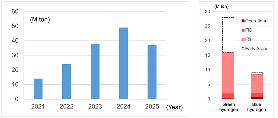 On the other hand, looking at the planned 2030 production volumes for green and blue hydrogen projects announced worldwide, the figures have started to decline as of 2025 (Figure 2, left). Furthermore, only 9% of the planned capacity for 2025 has reached Final Investment Decision (FID), with the majority still at the feasibility study or early planning stages (Figure 2, right).