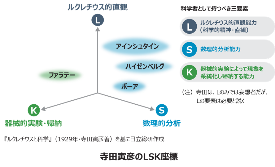 内藤:『ルクレチウスと科学』(『寺田寅彦随筆集 第二巻』(岩波文庫)収録)という寺田寅彦のエッセーがあります。ルクレチウス*14は現代科学につながるブラウン運動や原子の概念を分かりやすく詩にして残しましたが、これに対して「数理的分析もせず、実験による証明もなしにアイデアだけで論ずるのは科学といえるのか」という論調が西欧にもあったようです。寺田寅彦はこのエッセーの中で、科学者として持つべき三つの要素「L=ルクレチウス的直観能力」「S=数理的分析能力」「K=器械的実験によって現象を系統化し帰納する能力」を説いています。数理的分析と実験による証明だけでは科学とはいえない、科学にはルクレチウスのような直観力が必要なのだ、といっています。