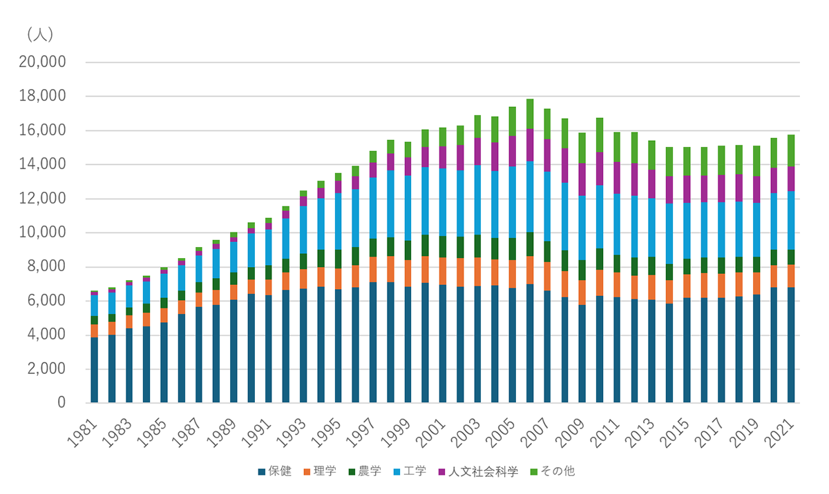 バイオテクノロジー関連の開発においては高度知識人材が必要である。特にバイオテクノロジーは基礎研究が重要であるため博士人材が必須となり、人材育成の点で大学の果たす役割は大きい。しかしながら、図1で示すように、博士人材は減少もしくは停滞の一途を示している。