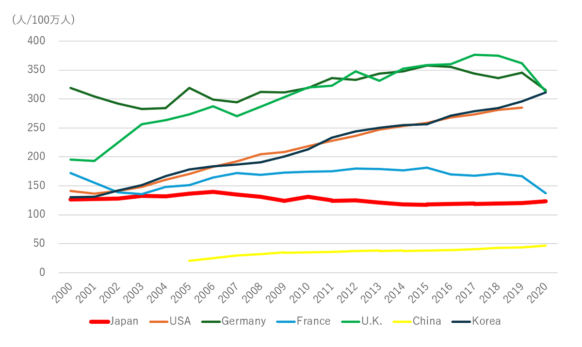 図2は主要7カ国の100万人当たり博士号取得者数の推移をみたものであるが、中国を除き、他国に比べて日本は常に低水準・定常にある。米国、ドイツ、英国、韓国は上昇傾向が続き、特に英国・ドイツは常に高水準である。
