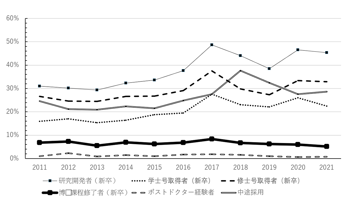図3 学歴・属性別 研究開発者を採用した企業割合の推移