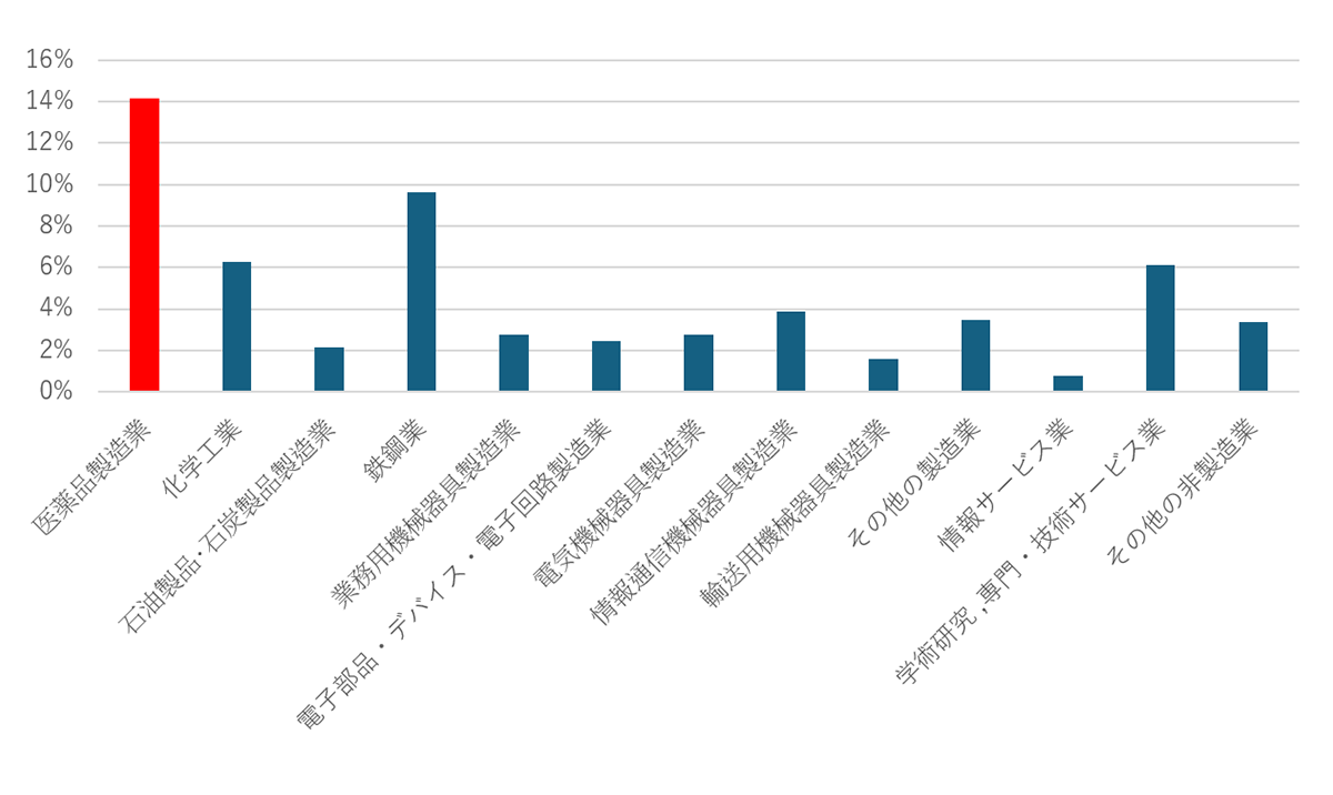 図4 産業別 企業の新規採用研究者に占める博士号保持者割合(2022年時点)