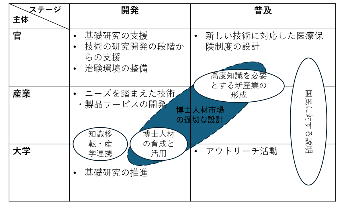 バイオテクノロジーの開発と普及は一体的に行われなければならない。どちらか一方が先行してもだめで、例えば医療技術の開発だけ先行しても、それを経済的に利用可能にする医療保険制度の整備が伴わなければ画期的な医療技術も普及せず、社会にインパクトをもたらすことはない。また大学側がいくら高度知識人材を育成したとしても、それを産業側が取り込まなければ、高度知識の移転は進まず、新たな産業形成にもつながらない。開発と普及の一体的な推進のためには、産学官の協働が重要である。
