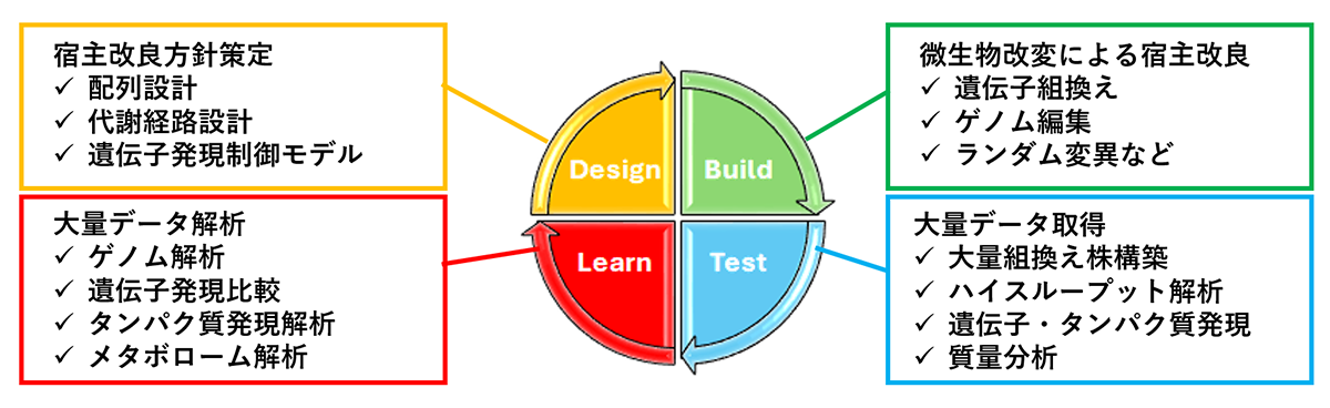 これまでのバイオものづくりは、2015年に米国コロラド大学にて代謝工学における概念として提唱されたDesign-Build-Test-Learn(DBTL)cycleを中心に考えられてきた(図3)。