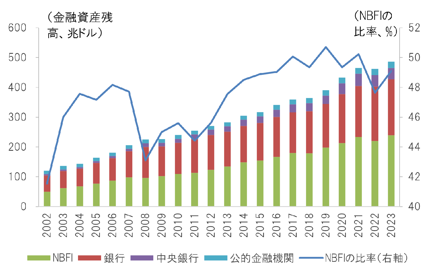 最近までの銀行規制強化と低金利を背景に、銀行に代わってその勢力を拡大しているのがNBFI(Nonbank Financial Intermediation ノンバンク金融仲介業者)である。金融安定化委員会(FSB*4)のグローバル・モニタリングレポートによれば、NBFIの総資産は過去10年間で約1.8倍に増加し、今や世界の金融資産の49%を保有するまでに巨大化した(図表2)。