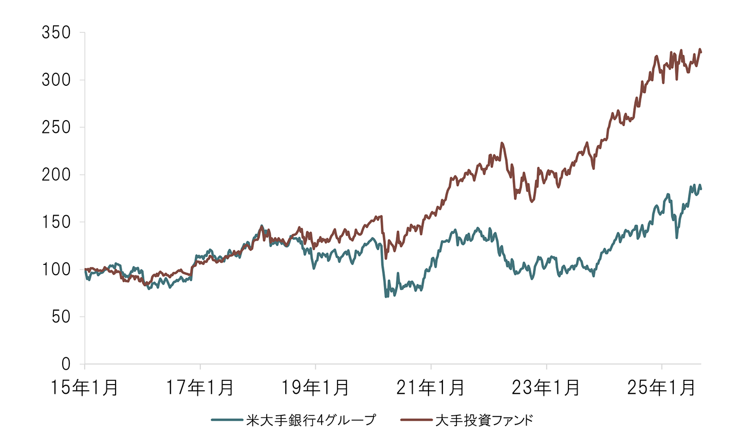 最近特に拡大しているNBFIが投資ファンドである。NBFIの一角を占める投資ファンド(例えばブラックストーン、アポロなど)の株価は、過去10年で米大手銀行の2倍の上昇率となっている(図表3)。
