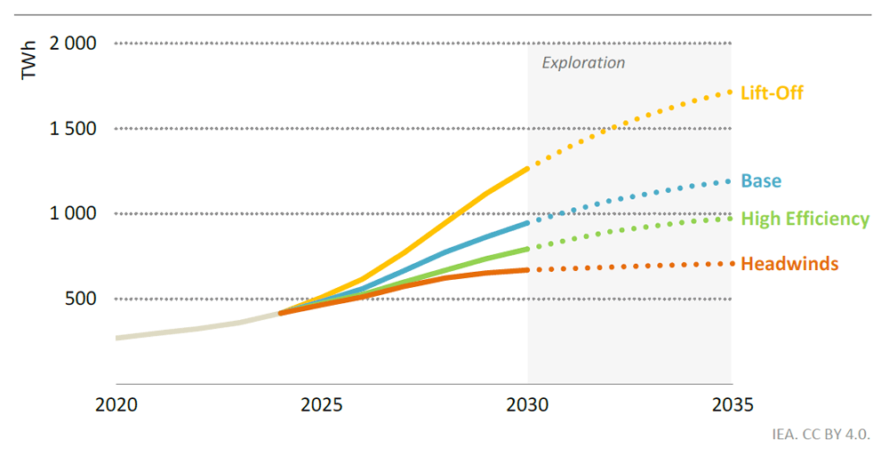 図1 世界全体のデータセンターの電力消費量見通し(2020年から2035年、シナリオ別)