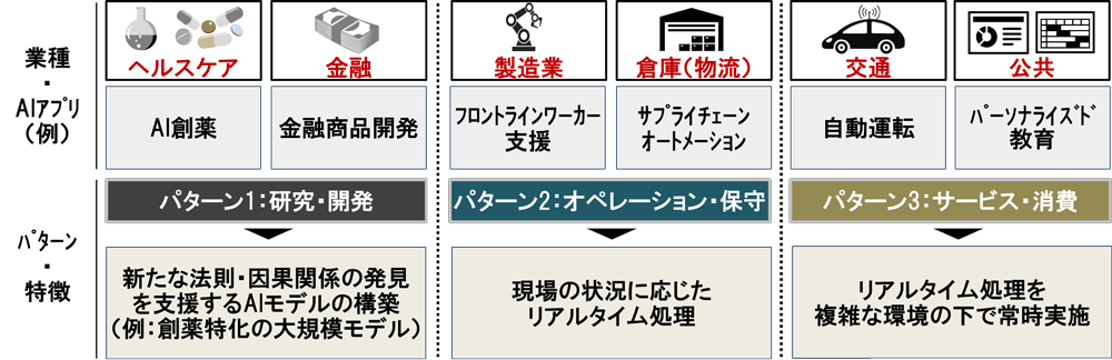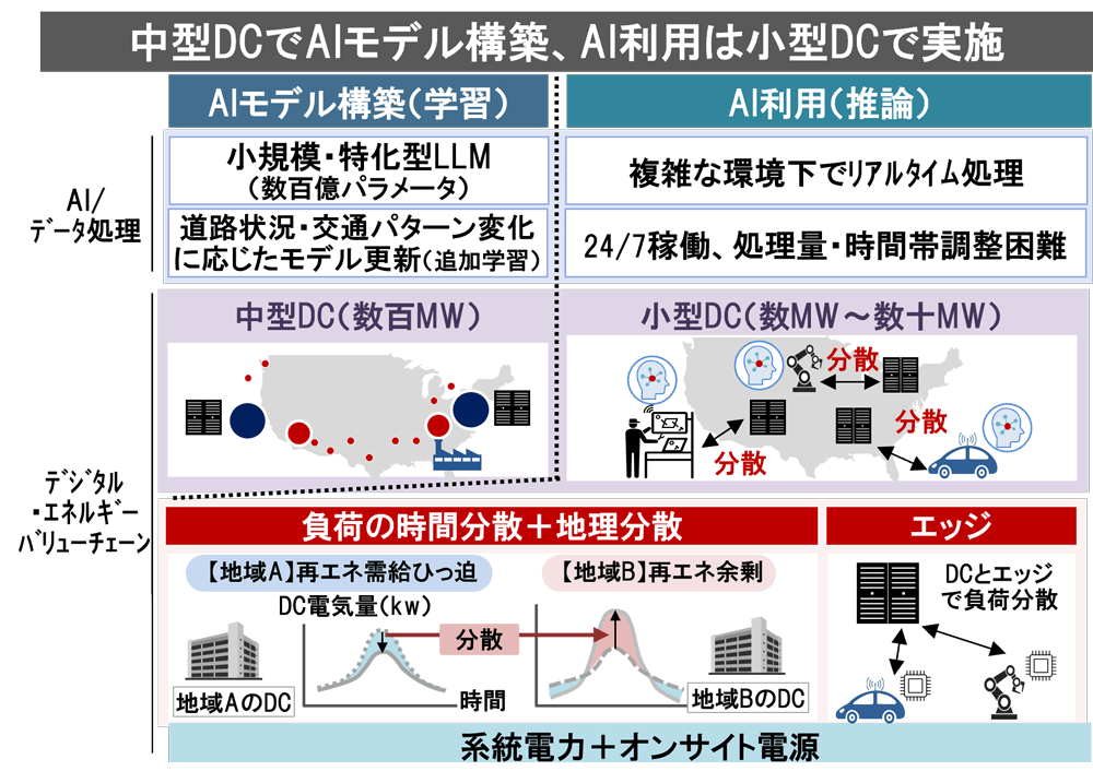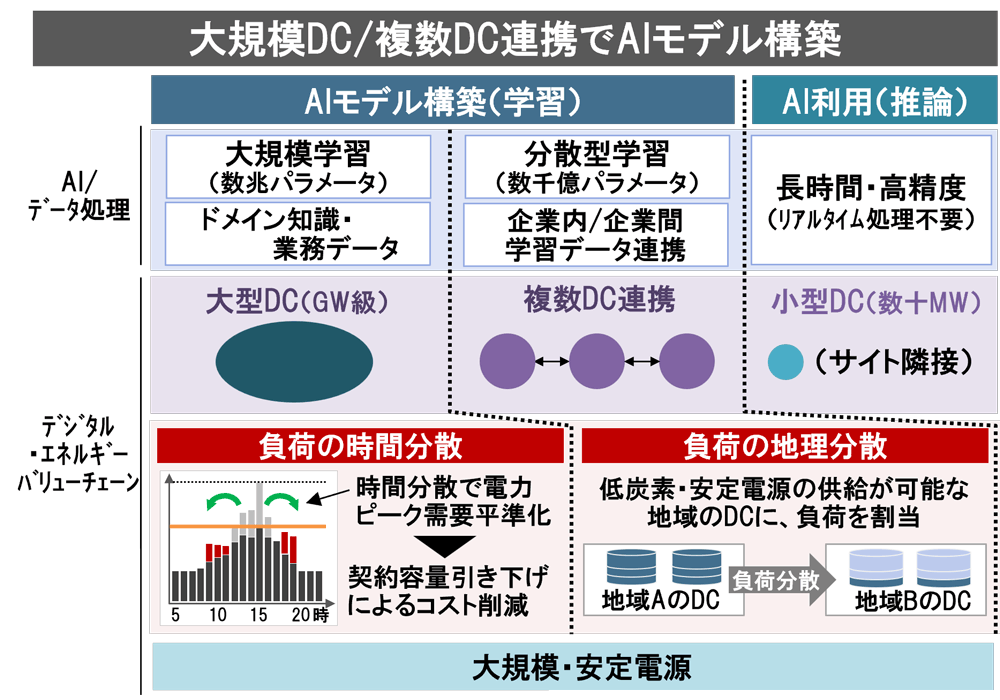 研究・開発で活用されるAIモデルは比較的大規模(数千億パラメータ以上)で、学習に必要な計算量も膨大となることが想定されるため、GW級の大型DCで集中的に処理を行うことが考えられる。このような処理のためには大規模な電力需要が発生するものの、学習段階ではリアルタイム性の高い処理は求められない。そのため、学習タスクの実行タイミングを電力需要の少ない夜間や再生可能エネルギーの供給が豊富な時間帯とするなど、AI処理負荷の時間を分散させることによって、DC電力需要の平準化・ピークカットを行う。一方で、全ての地域や企業において、大型DCでモデル構築を行うことは電力の供給制約などの観点から困難であるため、AIモデルの構築を複数DCが連携して分散的に行う方策も考えられる。その場合には、複数地域に立地するDC間で負荷の地理分散を実施することにより、各地域のエネルギーを最大活用する形で、創薬や金融商品開発の高度化・効率化などの実現が可能となる。
