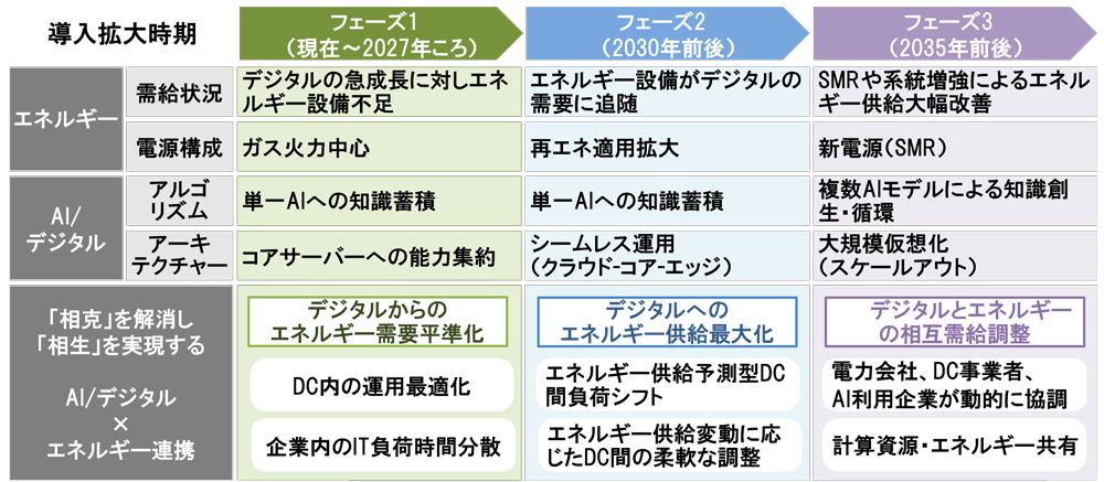 高度なAI活用を実現するための課題およびソリューションは、AI・デジタル向けエネルギーの需給状況に応じて、段階的に変化していく。図11の通り、現在から2027年ごろをフェーズ1とした場合、この段階ではAI/デジタルの需要の急成長に対してエネルギー供給が不足する。そのような状況では、限られたエネルギー供給力の範囲内で計算処理を行う必要があるため「デジタルからのエネルギー需要平準化」が課題となり、DC内の運用最適化や企業内のIT負荷の時間分散が求められる。次にフェーズ2は、再エネ設備や送配電網の整備が進むことでエネルギー設備の供給力がデジタル需要に追随するものの、デジタルからの需要を完全に賄うことは難しい段階である。この段階では、時間帯や地域によって変動するデジタルの需要と、再エネ中心の不安定なエネルギー供給力を動的に調整することで「デジタルへのエネルギー供給最大化」を実現することが求められる。そのため、エネルギー供給予測型のDC間負荷シフトや、エネルギー需給がひっ迫しているDCから余裕のあるDCへと負荷をシフトするなど柔軟な調整が求められる。フェーズ3では、SMRや送配電網の増強によるエネルギー供給の大幅な改善によりデジタルからの需要を十分に賄うことができるようになり、さらにAI技術の進展と次世代通信ネットワークの整備によって、複数事業者間での「デジタルとエネルギーの相互の需給調整」が可能になると考えられる。この段階では、電力会社、DC事業者、AI利用企業などによる動的な協調が期待される一方で、異なる企業・領域で動作するAIモデル同士が大量のデータをやり取りするため、DCへ短時間で集中的な計算負荷がかかる場合があり得る。このような状況においては、計算負荷の突発的な集中や通信遅延のリスクが課題となるため、DC事業者やAI利用企業が有する計算リソースを相互に共有したり、処理の優先順位付けをしたりしながら、負荷が集中する時間や場所を柔軟に調整する。その結果、業界・用途に特化したAIモデル同士がリアルタイムに連携しながら、複雑なタスクを共同で処理することが可能になり、気候変動や自然災害対応など複合的な社会課題の解決に貢献することが期待される。