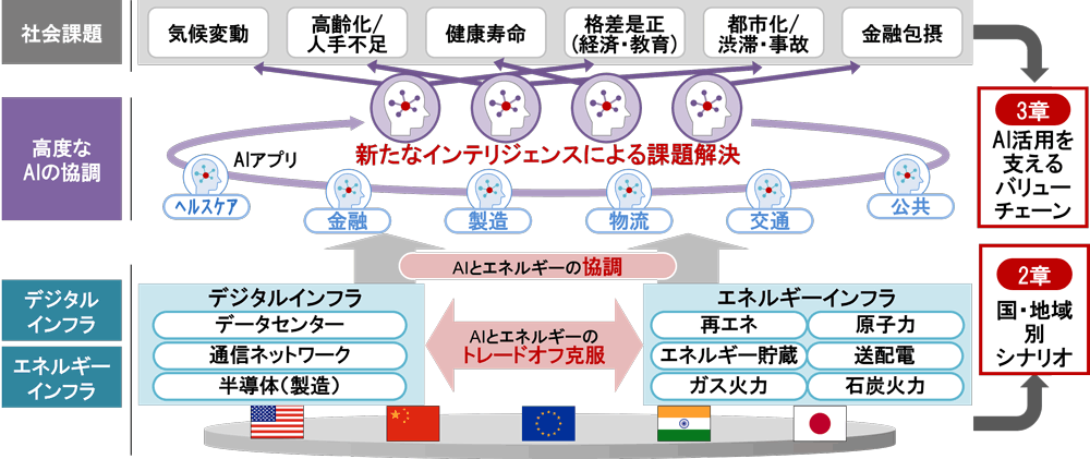 図2は、技術を最大限活用することで、デジタルインフラとエネルギーインフラのトレードオフを克服し、AIとエネルギーが協調して持続可能な社会を実現する2035年の将来像を示している。この将来像の具体的な姿は、国・地域のエネルギーインフラをめぐるさまざまな事情によって異なる。そこで2章では、2035年におけるグローバルおよび主要な国・地域のエネルギーインフラのシナリオを概観する。一方で、製薬などの研究・開発や、製造業におけるオペレーション・保守など、各業種のAI活用の方向性により、必要となるAIモデルの学習や推論の特徴が異なることから、AIを活用する各業種が必要とするデジタルインフラとエネルギーインフラも異なる。そこで3章では、2035年のAI活用の高度化を支える、今後のデジタルインフラとエネルギーインフラによる相互協調的な価値創出システム(本レポートでは「バリューチェーン」と呼ぶ)を考察する。最後に4章で、デジタルインフラとエネルギーインフラが協調する新たなエコシステムの形成に向けた今後の課題を述べる。