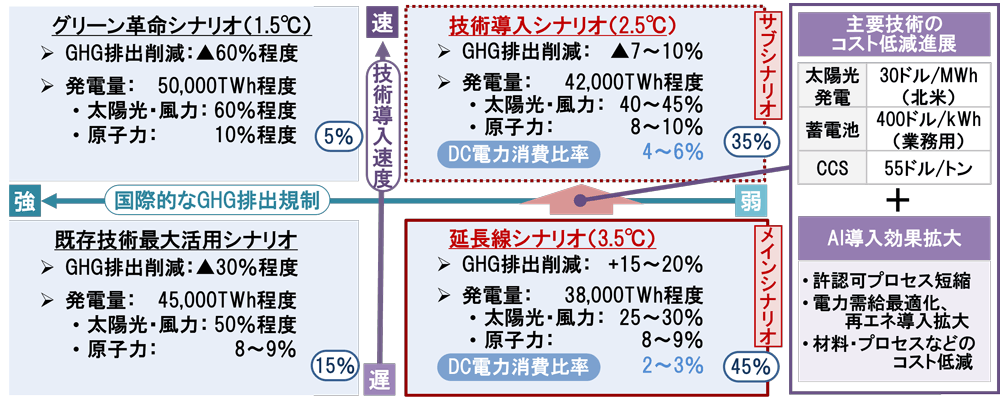 1.2で述べた、AIの活用が進み、デジタルインフラを支えるエネルギーの供給が強化されるポテンシャルを有するのが、技術導入シナリオである。ただし、後述するように、グローバルなGHG規制の動向や幅広い技術の普及速度とは別に、国・地域レベルの産業政策や民間投資によって、AI関連のエネルギー技術の導入が独自に進展する可能性も考慮する必要がある。