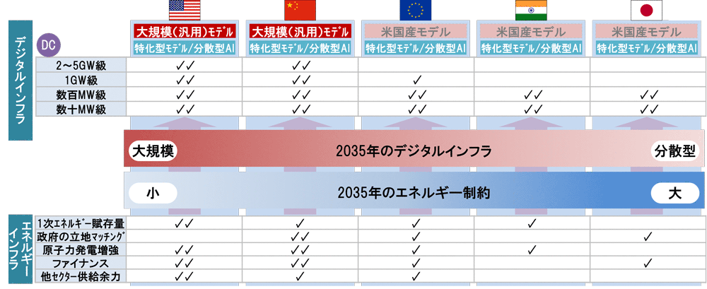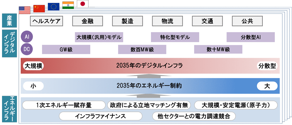 2035年における国・地域ごとのAI向けデジタルインフラの展開形態は、各地域のエネルギー供給能力や系統の制約(以下、エネルギー制約)の大小に左右される(図5)。具体的には、国内エネルギー資源の賦存量、政府によるデジタルインフラとエネルギーインフラの立地政策・誘導を通じたマッチング、大規模・安定電源である原子力(小型モジュール炉を含む)の新設の実現可能性、デジタルインフラ・エネルギーインフラのファイナンス環境、セクター間での送配電網や電源の容量の獲得競争といった要因が複合的に作用し、デジタルインフラに対するエネルギー供給の制約の程度が決まる。エネルギー制約が比較的小さい地域では数GW級の大規模DC構築が可能となる一方、制約が大きい地域では大規模化が難しく、数十MW級の小規模・分散型DCが中心となる可能性がある。