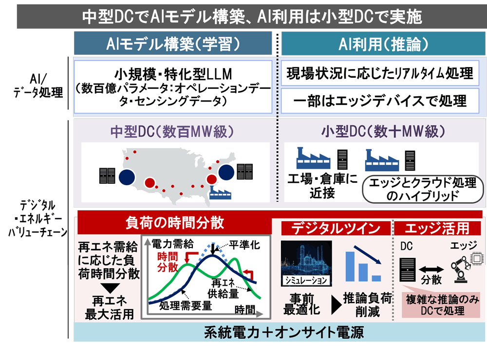 製造業や物流分野などにおけるオペレーション・保守のケースでは、比較的小規模(数百億パラメータ)で業種・企業特有のデータを学習した特化型のAIモデル構築に加え、AI利用の段階では現場の状況を基に秒単位で判断・制御するリアルタイム処理が必要となる。こうした用途では、AIモデルを構築するための学習処理は数百MW級の中型DCで行い、現場でのAI利用段階では小型DCを工場などに近接して設置することで低遅延な推論を行う。一方で、工場でのAI・ロボットの利用が増えるとDCへの負荷や電力需要も大きくなるが、産業分野における脱炭素の実現に向けて、再エネ活用による低炭素な運用も課題となる。そのため生産計画や予測など、処理時間が調整可能な場合には、変動する再エネ供給に応じた負荷の時間分散を実施することが選択肢となる。また、デジタルツインを活用して、事前に生産工程などを最適化することで毎回の推論処理を削減するとともに、エッジコンピューティングにより比較的単純な処理は各デバイス(例:工場内のロボット)で実行し、複雑な処理のみをDCで行うことで、DCへの処理集中によるエネルギー利用のピークを抑制することが可能となる。