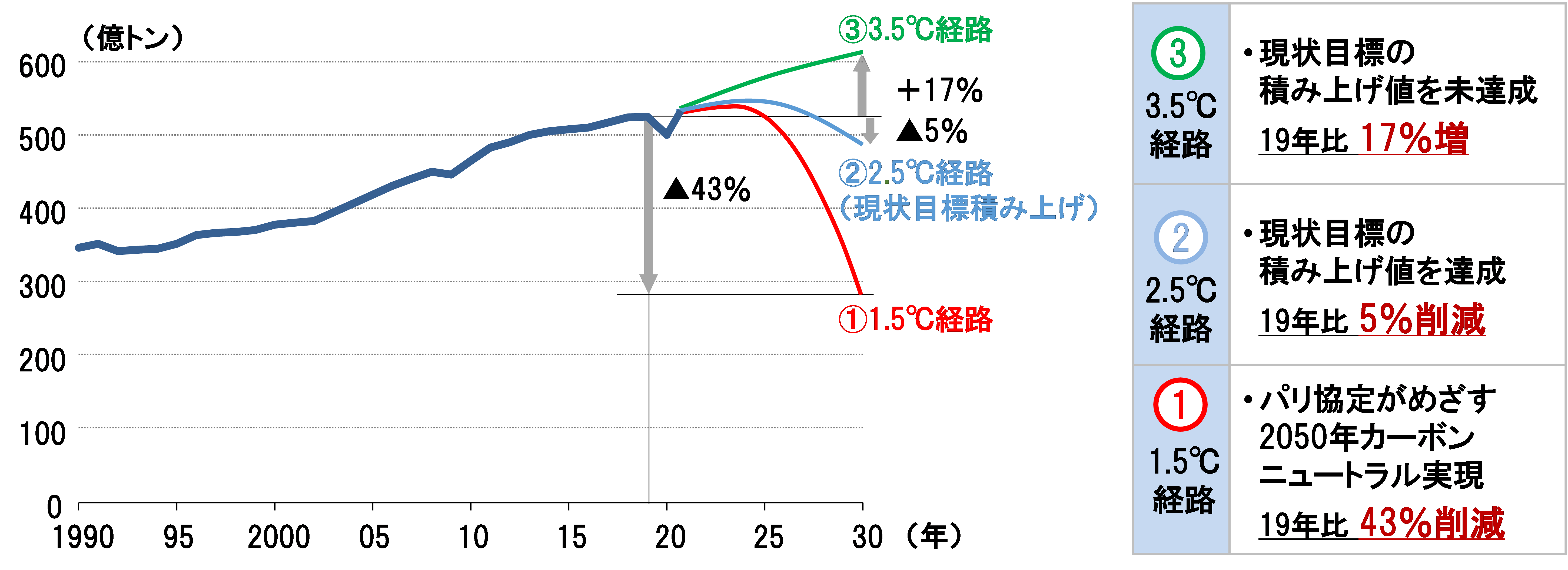 パリ協定の1.5℃目標を実現するための2030年排出削減目標(19年比43%)を積み上げるのは相当困難となっている。米国・中国などが現行目標を達成できないことも想定され、気候変動に関する政府間パネル(IPCC)の報告書でその可能性に警鐘を鳴らしている3.5℃経路に向かうことも考えられる(図2)。