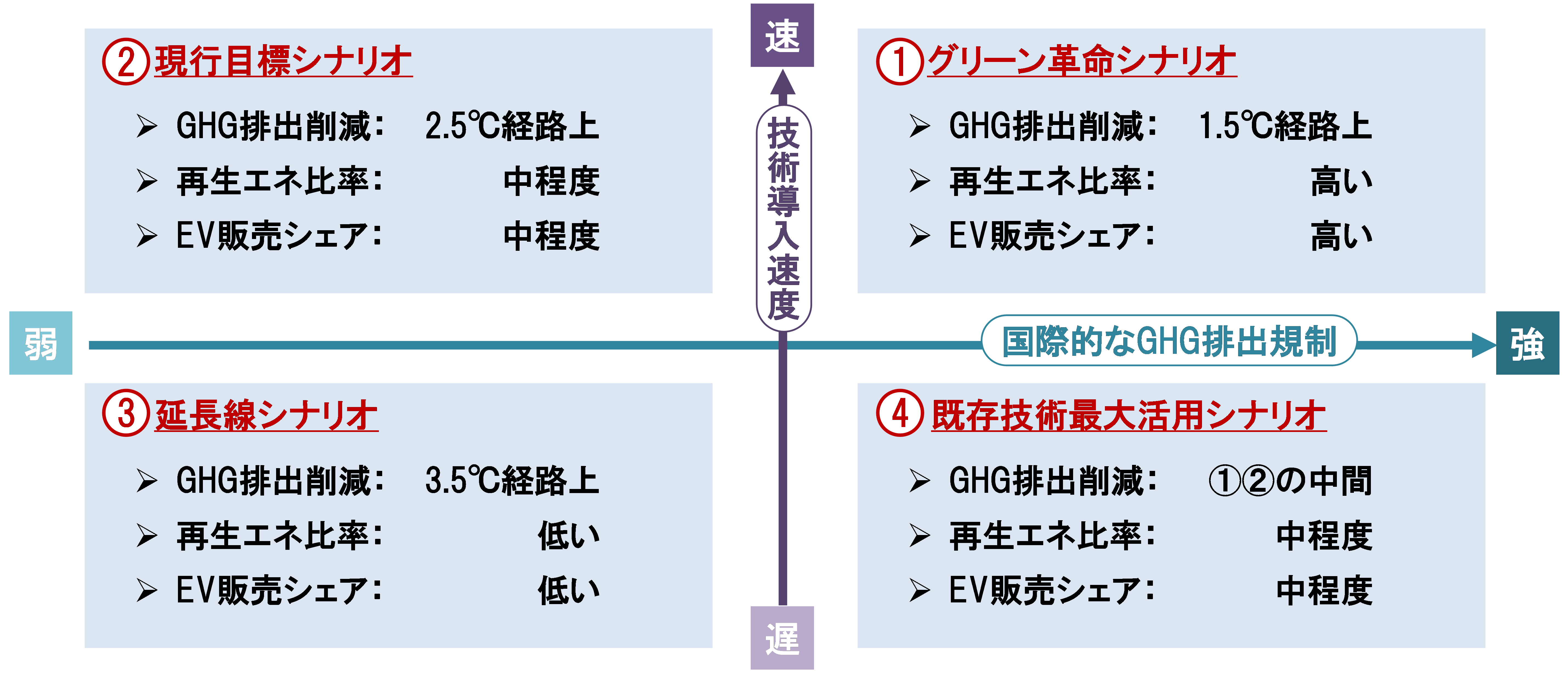 シナリオプランニングでは、将来シナリオを決定する因子を抽出した上で二つ程度に絞り込むが、本研究では、一つを「国際的な温暖化ガス排出規制」とし、もう一つを「技術導入速度」と特定した。