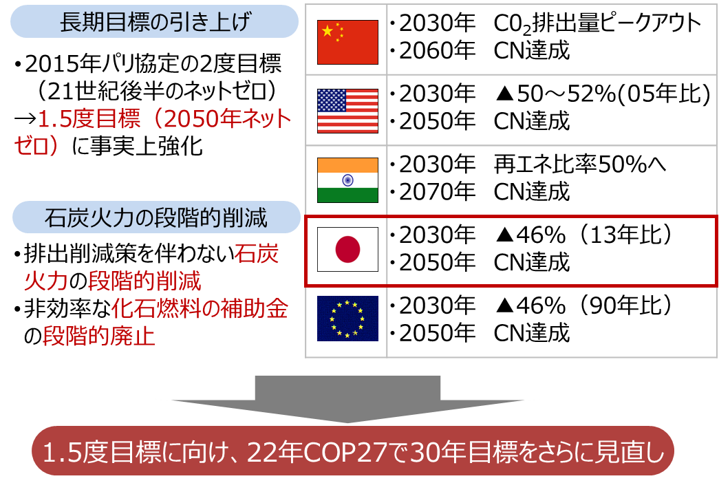 2021年11月に開催された国連気候変動枠組条約第26回締約国会議(COP26)では、世界の平均気温上昇を産業革命以前に比べて1.5℃に抑える努力を追求すること(1.5℃目標)、そのために2050年ごろに大気中に放出される二酸化炭素の排出量から除去される量がゼロとなる状態(ネットゼロ)をめざすことが確認された。その手段として、排出削減策を伴わない石炭火力発電の段階的削減などが合意された。2022年に開催されるCOP27に向けて、1.5℃目標に即した2030年の目標見直しが検討される(図1)。 気候変動対策には、太陽光・風力発電などの再生可能エネルギー設備や、エネルギー消費の電化、製品の軽量化による省エネ、水素の利用などが必要となる。