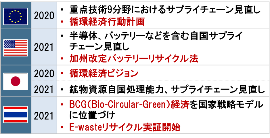 日立総研は、重要鉱物資源に関する複合的環境課題対策の方向性として、代替素材の開発に加えて、資源循環による、重要鉱物資源採掘・製錬抑制の重要性が拡大すると考えている。世界各国は、自国での資源安全保障という目的とあわせて、重要鉱物資源に関するサプライチェーンの循環化の政策や実証を進めている(表1)。例えば、EUは「循環経済行動計画」(2020年)に基づき製品の循環化規制の改定を進めている。 資源循環による環境負荷低減のためには、第一に、製品の使用段階において適切な保守・点検やサービス化によって可能な限り製品使用期間を長くすること(長寿命化)が重要である。第二に、製品の使用後には、製品を回収・分類したうえで、劣化状態に応じて製品の再利用、製品の中核部品の補修・再組み立て(部品再生)、製品分解後の材料の直接再利用、材料のケミカルリサイクル(化学的処理による二次材料の抽出)を選択・実施し、二次利用を進めることが重要となる。