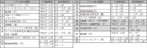 IPCCでは23のAOGCMを採用 IPCCの第4次報告書では、海洋の作用*2やCO2の効果をはじめ、他のさまざまな物理過程を取り込み、かつ一定の精度が検証されたモデルとして、以下の23のAOGCMが採用されています(日本からは2機関、3つのモデル)。これらはいずれも、広義には「全球プリミティブ・モデル」といわれるタイプに分類されます。
