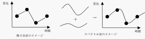 まず「プリミティブ」という言葉の意味ですが、これは一般的なイメージである「原始的な」「初歩的な」というニュアンスとは少し異なります。むしろその逆で、「基本的な原理までも(省略せずに)計算に取り込んでいる」というポジティブな意味をもっています。その具体的なイメージは以下のようなものです*3。 最初に、数値計算を行うための座標を地球上に定めます。これは基本的に緯度・経度をベースに数百kmオーダーの間隔で設定され、さらに、それを鉛直方向に数十層重ねて地球大気を立体格子状に網羅します。海洋についても基本的には同様に格子状の座標を設けます(具体的な解像度については前出の表をご参照ください)。これらの格子点に気象変量(例えば気温なら気温;総称してGrid Point Value:GPVと呼ばれます)を与え、物理過程を表現した方程式に従って将来の推移をシミュレーションしていきます。これには大きく分けて以下の2つの方法があります。