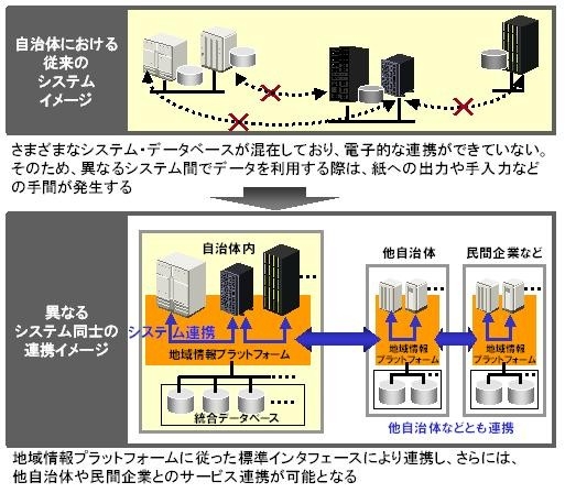 「地域情報プラットフォーム」とは、自治体や民間企業などの情報システムが相互に接続・連携できるようにあらかじめ各々のシステムが準拠しておくべきルールを定めた標準仕様です。総務省が主催した「地域における情報化の推進に関する検討会(2003年12月〜2005年3月にかけて計6回開催)」の中で提言され、「財団法人全国地域情報化推進協会(APPLIC)」*1が標準仕様書の策定を進めてきました。2008年9月現在「地域情報プラットフォーム標準仕様書V2.1」が公開されています。 地域情報プラットフォームの目的は、SOA*2やXML*3などの手法・技術を活用することにより、異なるシステム間のシームレスなデータ連携を可能とし、自治体などがさまざまなサービスを連携・統合して提供できるようにすることです(図表1)。