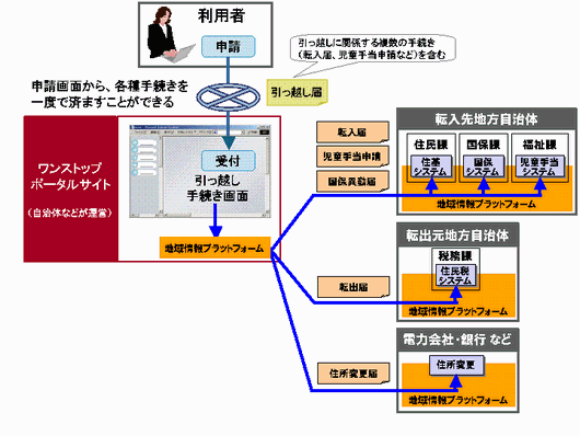 総務省は、「引越ワンストップサービス分野」および「地域活性化分野」におけるワンストップサービスの立ち上げを推進するため、準拠システムの実証実験「地域情報プラットフォーム推進事業」を2008年度から開始しています。