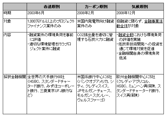金融機関の環境経営に関する同様の行動原則としては、2003年に策定されたEquator Principles(以下「赤道原則」)や2008年2月に策定されたCarbon Principles(以下「カーボン原則」)があります。前者は、開発コストで1,000万ドルを超える規模のダムや発電所建設、資源開発などのプロジェクトファイナンスを行う際、環境面での負荷評価を行い、融資実施後は環境対策状況をモニタリングすることなどを定めています。後者は、CO2排出量を適切に管理する米国の石炭火力に対して融資することを定めています。一方、気候原則は、プロジェクトファイナンスだけでなく、気候変動問題に対する金融機関の事業活動全般に関する行動原則を規定するものであり、気候変動問題に対して金融機関が取るべき環境経営の方向性をより包括的に示している点に特徴があります。