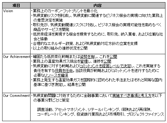 気候原則は、「Vision(ビジョン)」、「Our Achievement(我々が既に達成した事項)」、「Our Commitment(我々のコミットメント)」の3つの大項目で構成されます。気候原則を採択しようとする金融機関は、まず、「Our Achievement」に規定されるレベルの取り組みを実施するか、実施に向けた具体的な計画を策定することが求められます。その要求を満たし、気候原則を採択した金融機関は、「Our Commitment」に規定される行動原則に基づき環境経営を実践することになります。注目すべきは、金融事業の各活動ごとに気候変動問題に対処するための施策を講ずるよう要求している点です。