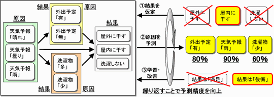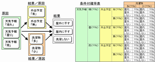 上記図2の例では、「洗濯物を干す」という結果に繋がりやすい原因の推測を行っています。この場合、「天気の良し悪し」や「洗濯物の量」といった人によって捉え方が異なるあいまいなものでも、さらに「天気が曇りの割合」といった各出来事が発生する確率が少し偏った判断でも適用可能であり、推測を始めることができます。故に実社会におけるさまざまな場面、例えば、店員の会話や店の雰囲気といった「原因」と商品の売れ行きという「結果」、または自動車の使い方やメンテナンスの状況といった「原因」と自動車の故障個所という「結果」といった場面のあいまいな関係への適用が可能です。