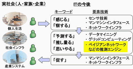 「ユビキタス情報社会(いつでも・どこでも・だれにでも)」に続く次の情報社会として「アンビエント情報社会(察する・予測する・促す)」への期待が高まりつつあります。アンビエント情報社会の実現に向けて必要とされる要素技術として、ベイジアンネットワークへのニーズはより高まるものと考えられます。