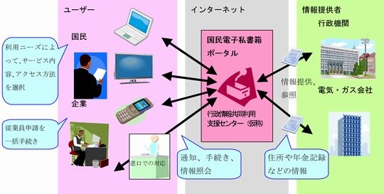 「国民電子私書箱(仮称)」は、引越し・退職・出産などライフイベントにかかわる個人情報の入手・管理を希望する国民や企業を対象に、公的機関などが提供するネット上の専用口座です。このネット上の専用口座を通して、社会保障分野のみならず、幅広い分野でのワンストップの行政サービスが提供されます。