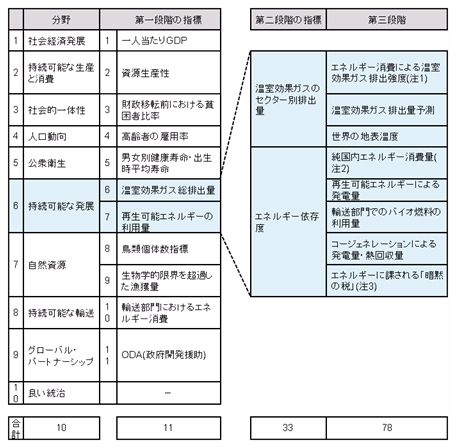 このダッシュボードには10分野を対象として、各分野につき、三段階に分かれた詳細な指標が設けられています。第一段階で11種類、第二段階で33種類、第三段階で78種類の指標が存在し、その多様性が特徴的です。「持続可能な発展」についてより詳しく見ると、第二段階には2種類、第三段階には8種類のより詳細な指標が含まれています。