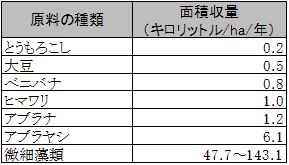 表:原料の種類によるオイルの面積収量比較