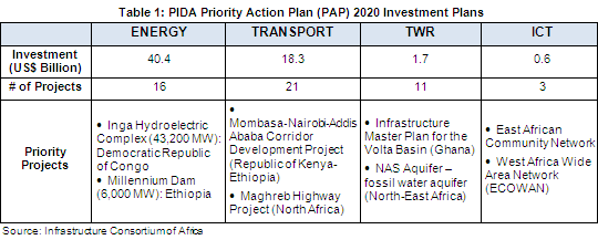 現在のアフリカ経済は活況を呈しており、特にアンゴラ、ナイジェリア、チャド、エチオピア、モザンビーク、ルワンダの6カ国は2000年から2010年までの10年間で世界トップ10位に入る高い経済成長率を達成している。一方、アフリカも他の新興国と同じくぜい弱なインフラが経済成長の足かせになりつつあり、インフラ改善がアフリカ諸国で喫緊の課題となっている。このような背景の中、アフリカ連合(AU)はアフリカ・インフラ開発プログラム(PIDA)と称するエネルギー、交通、水輸送、情報通信の4分野での開発計画を2012年から2040年にかけて策定。同プログラムではインフラ投資として同期間で3,600億ドルが拠出される予定であり、アフリカのインフラ関連事業でさまざまな機会を提供する見込み。