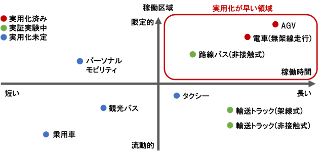 走行中給電の実用化は、特定走行路を利用するためレイアウト固定化の影響を受けにくく、かつ稼働実績が明確でインフラ整備・運用コストの回収計画が立てやすい産業分野で進んでいます。図2は、横軸にインフラ投資の回収性に関する指標として稼働時間を、縦軸にレイアウトの固定化に関する指標として稼働区域をとり、各業種における走行中給電の取り組み状況を示したものです。物流や旅客運輸業界は、オペレーション時間が生産効率に直結しているため、ダイナミックチャージングの導入によるロスコスト減少効果が大きいという特徴があります。また公園や都市内循環バスやパーソナルモビリティ、倉庫内搬送では稼働区域が限定されているという特徴があります。こうした点を兼ね備えた領域から、実証実験、実用化が進んでいます。
