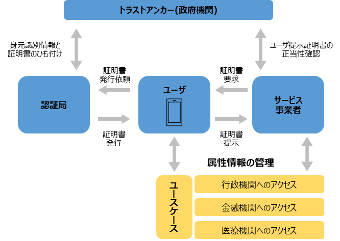 デジタルIDウォレットとは、デジタルID(デジタル化されたユーザ(個人・組織)の身元識別情報*1)による身元提示や自らの属性情報の提供を、PCやモバイル端末上でユーザ自身が管理する仕組みです。ここでの属性情報とは、経歴(学歴証明書・保有資格証明書など)、健康・生活習慣情報(保険加入内容・処方箋など)、金融・決済情報(口座情報・ローン履歴など)などをさします。デジタルIDウォレットにより、ユーザと行政機関や民間医療機関などのサービス事業者の間での高信頼な身元提示・確認がオンライン・オフラインを問わず実現可能になります。具体的には、図1に示す通り、国民識別番号や納税者番号などを発行する政府機関をトラストアンカー(信頼の基点)とし、認証局が政府機関管理の身元識別情報とデジタルIDをひも付けて証明書を発行します。ユーザは、この証明書をモバイル端末上でサービス事業者に提示することで身元提示を実施できます。また、ユーザは属性情報を提供する際にデジタルIDウォレットを活用することで、共有範囲や共有した情報の追跡も可能になります。
