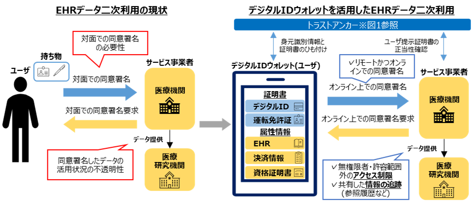 図2:EHRデータ二次利用の現状とデジタルIDウォレット活用例
