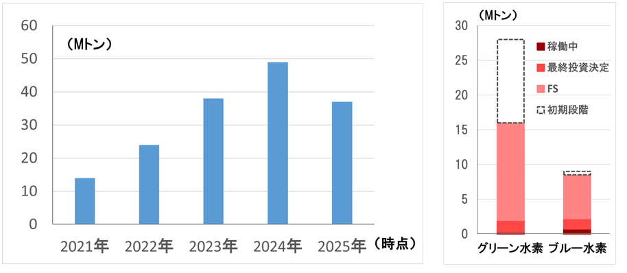 図2:グリーン・ブルー水素の2030年生産量計画値の推移(世界合計、左)と2025年時点のステータス(右)